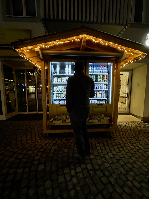 Here’s Brian at a vending machine – it offers all sorts of dairy products including cheeses and a variety of drinks too.