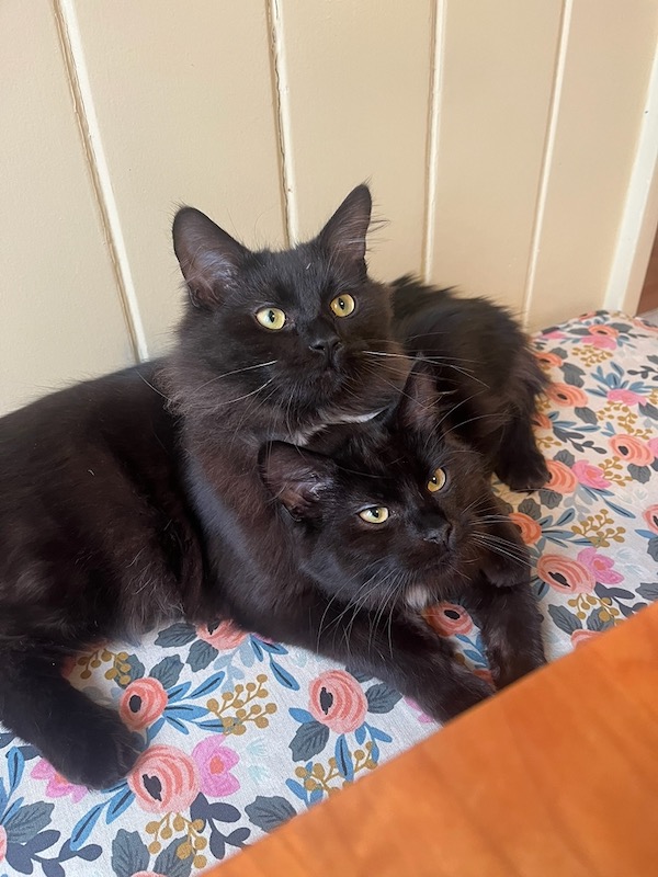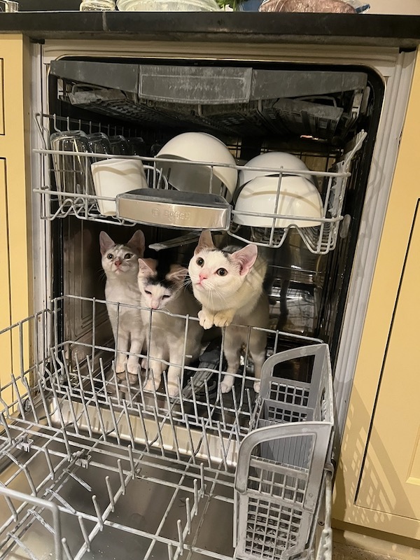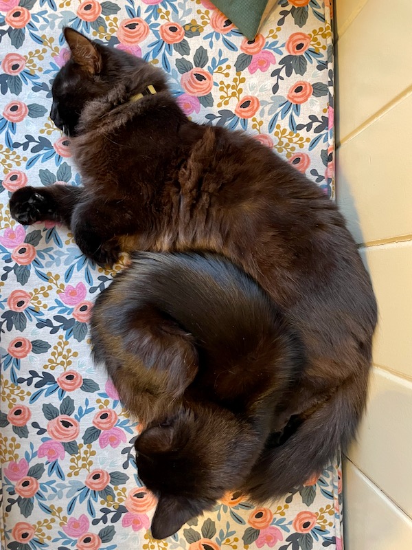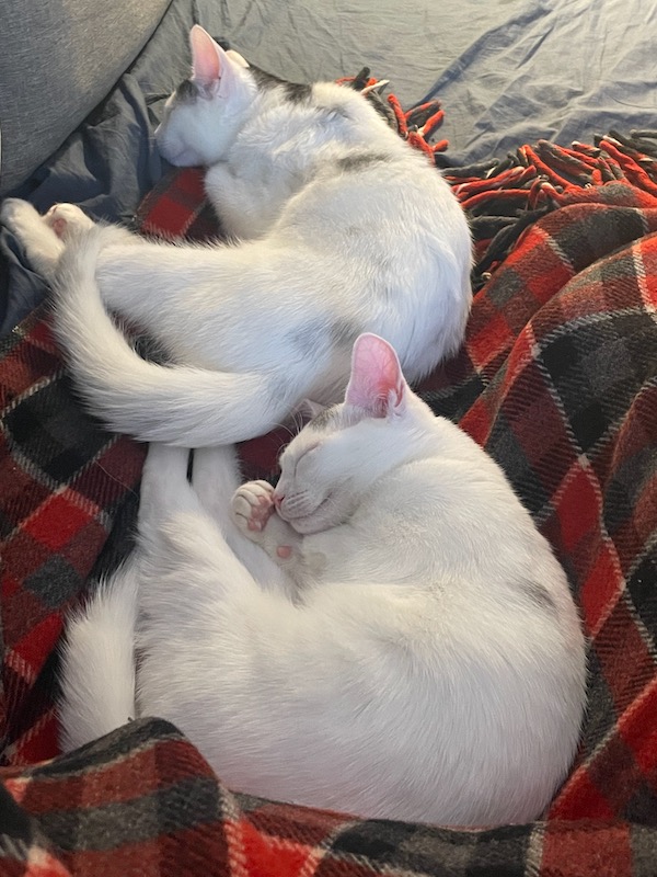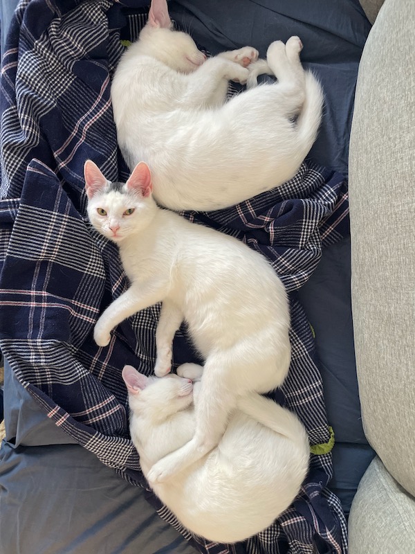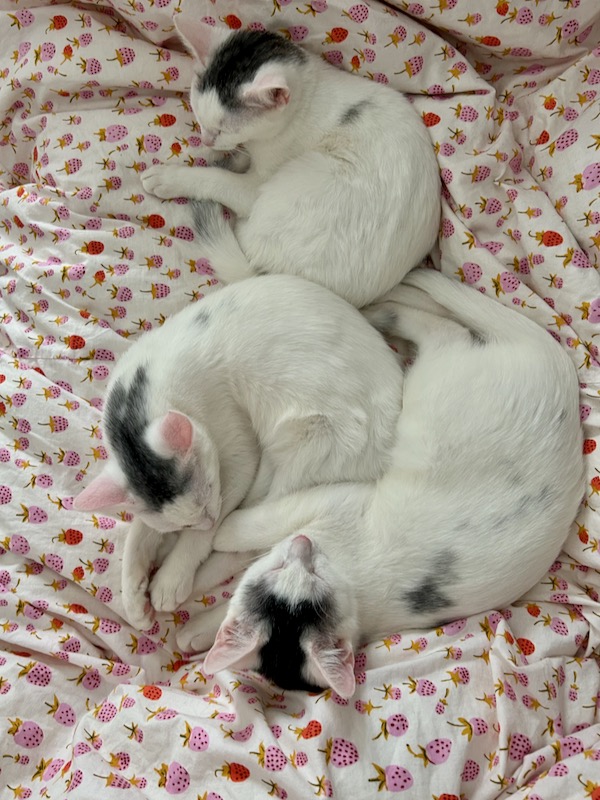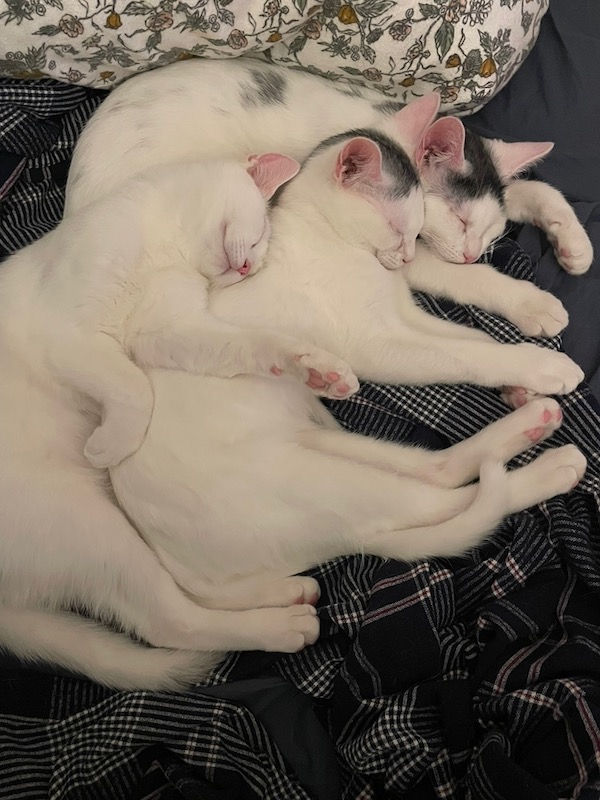 Having cats – especially three – can sometimes feel like a handful. They take turns acting aggressively affectionate by jumping into your lap and insisting on lots of pets. They are all loud purrers. But I do love to watch them playing and sleeping contentedly.