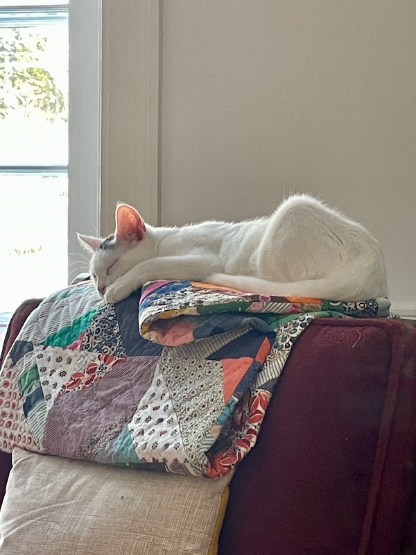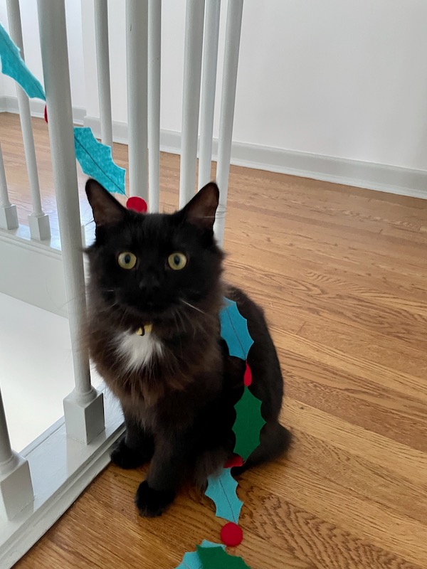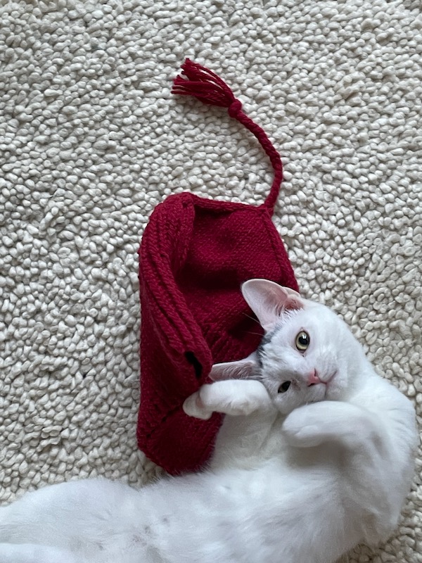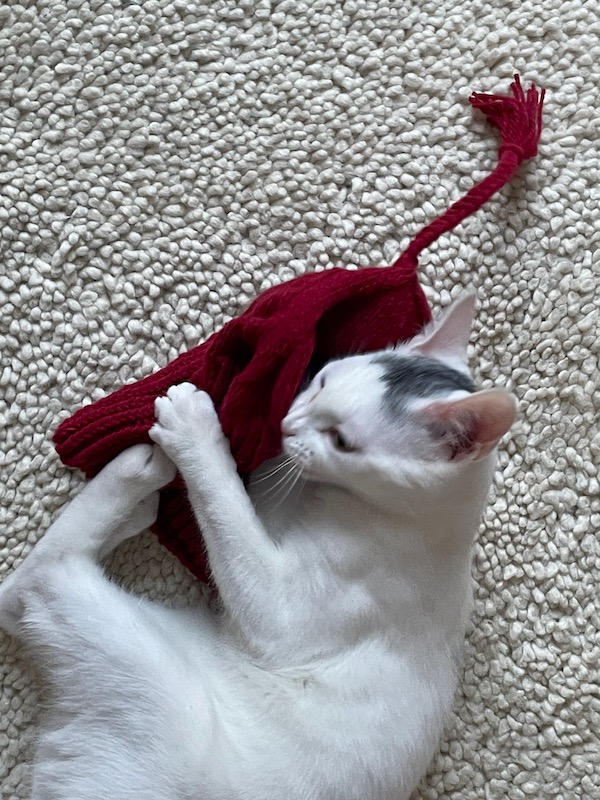 The cats are so fun and sweet. They follow us around and give little squeaky meows now and then. They are only about 8 months old so they are very playful and we laugh all the time at their antics. That’s Sam above “helping” me put Christmas decorations away. And below Fred thinks he is helping me with a sewing project.