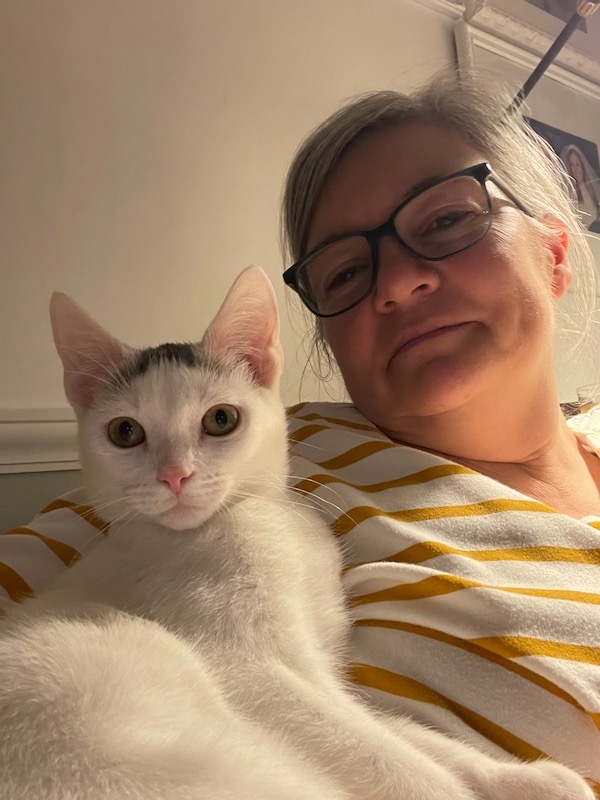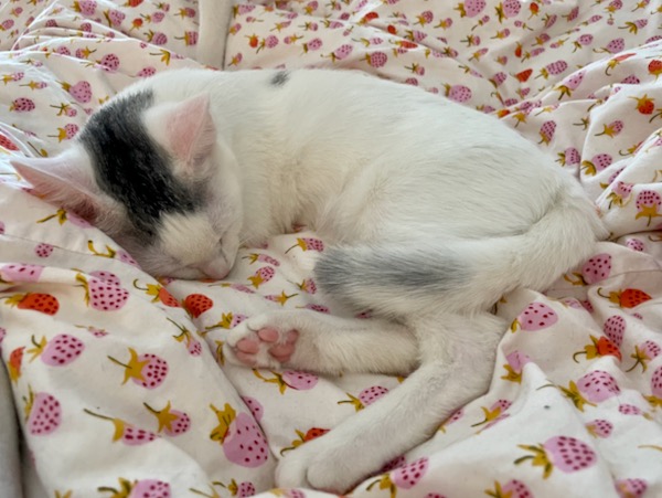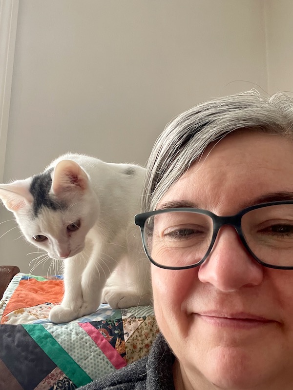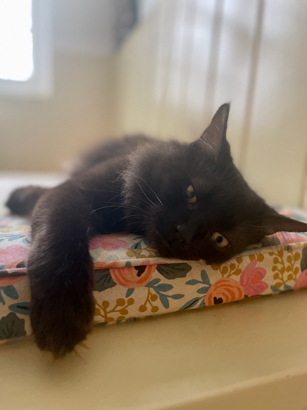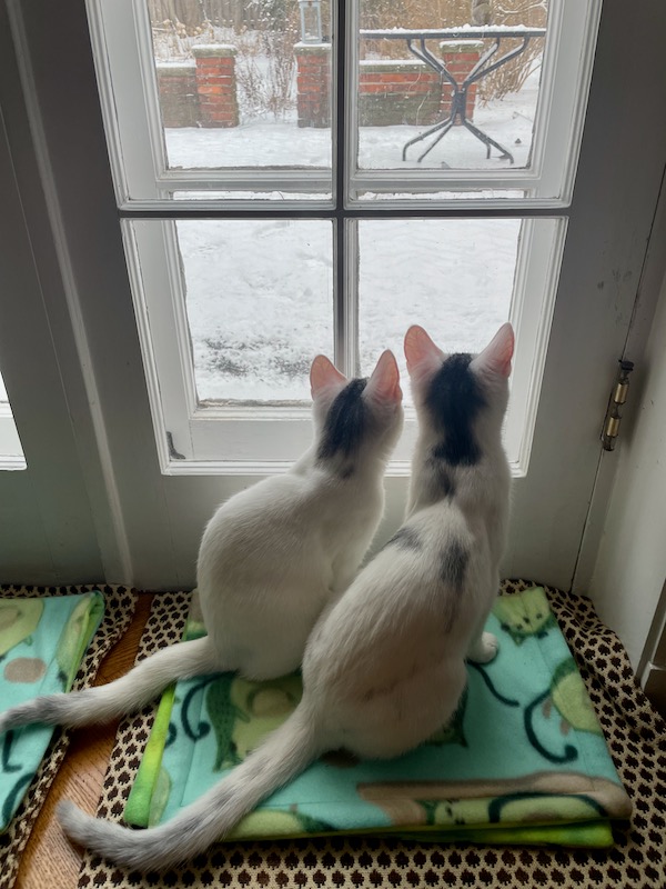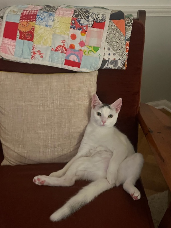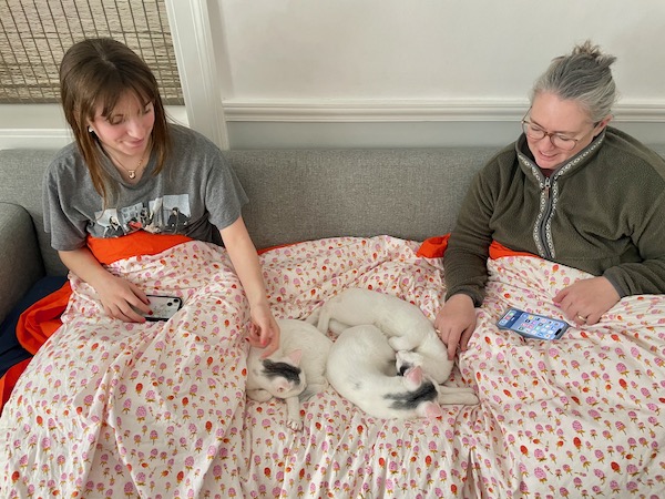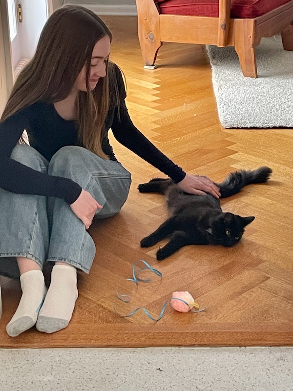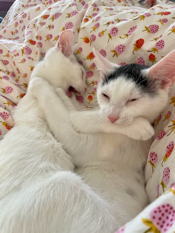 I am so pleased with how it’s going with Fred and Sam. It’s made this transition easier and happier. And I’m happy to give Claire the experience of being close to a cat – something we just couldn’t do since Brian is allergic to cats. I will note that Brian has been very supportive from afar.