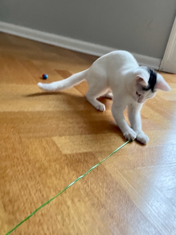 For the first almost 24 hours poor Steve hid in a corner of our bathroom. But after Claire gently lured him out with a toy he’s made himself thuroughly at home.