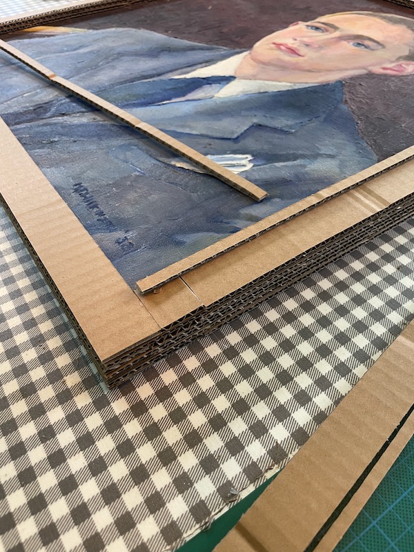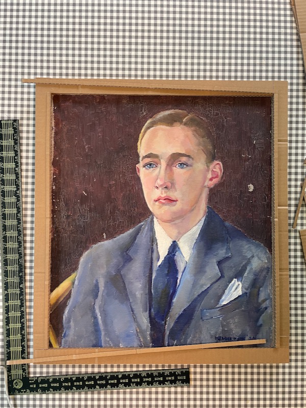 I have another canvas painting – a portrait that I got for a few bucks at a church rummage sale. I love the painting. It’s been leaning against the wall on top of the hutch in my living room for a long time. And I thought it was time to give it a proper frame.