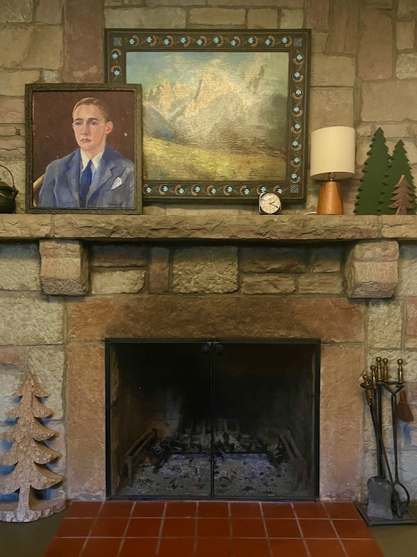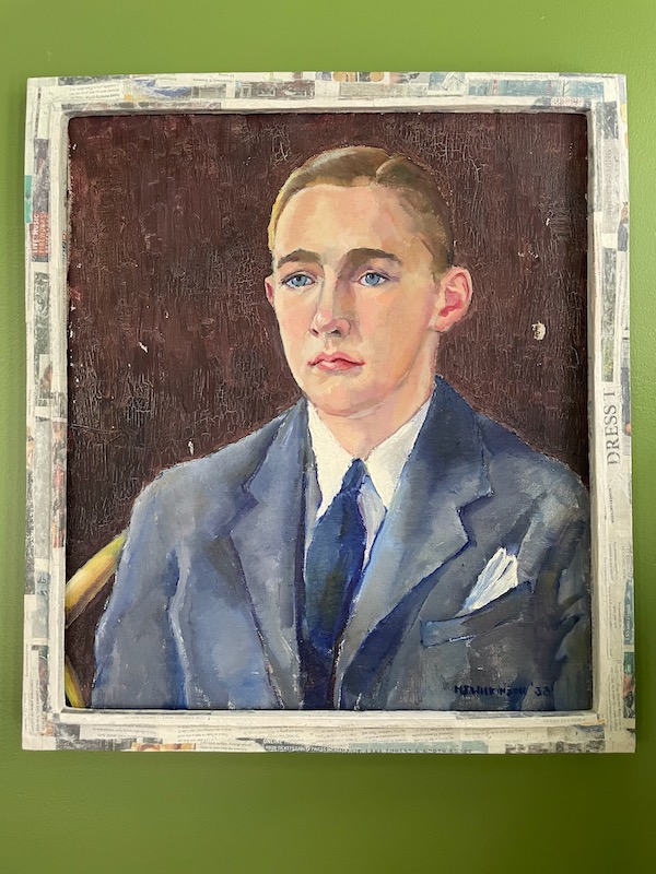 The frame is made of layers of cardboard so, delightfully, I spent zero dollars on this project. Below you can see how the papier mâché looks before I painted it. It’s tempting to leave it with the newspaper exposed. I could make up a story about the young man being a journalist and distant relative. But no, I wanted it to go with the look of the other frame. I painted it in a sort of graphic faux bois pattern.