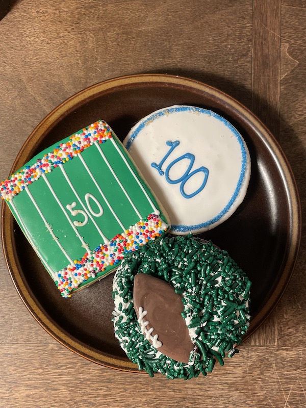 Here are some (unsold) bakery goodies that Claire brought home from work – to help celebrate the Superbowl. She brings lots of things home when she works on Saturday because the bakery is closed Sunday. She said they also donate stuff to a food bank. Anyway – the point is – I’m spoiled by all the scones and bread and danishes and cupcakes and cookies, etc.