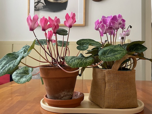 Here’s a photo of a couple cyclamen on my table. A little bit of life to make these winter months bearable.