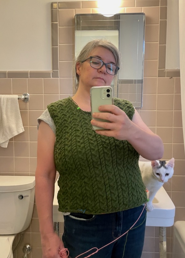 I’ve been trying to finish this cable-knit sweater. Almost time for sleeves.