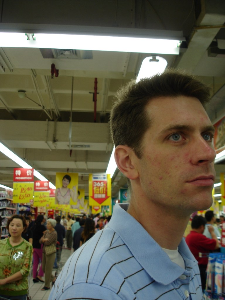 On Sunday we went to a big grocery store called Carrefour. It’s a French chain and we heard it was supposed to have lots of western-style food. We did find the groceries we were looking for but it was very tiring because of the huge crowd. I thought Meijers in Midland on a weekend was bad. The crowds here in China don’t have the same courtesy that you find in the States. People don’t mind walking right in front of you and then stopping in the middle of and aisle or bumping into you or cutting you off. We decided we don’t really need to go there again – we can get most of the things we found at a local grocery store. Here are a couple pictures. Brian was about to lose it while we were waiting in line. We’ll never complain about our local Evanston grocery being busy again.