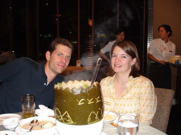 Here is a photo of Brian and I at a restaurant – they served a melon soup inside a huge steaming melon. We don’t have that kind of melon here but it’s similar to a watermelon. It’s white inside and I think it might be called winter melon. The soup was pretty good.