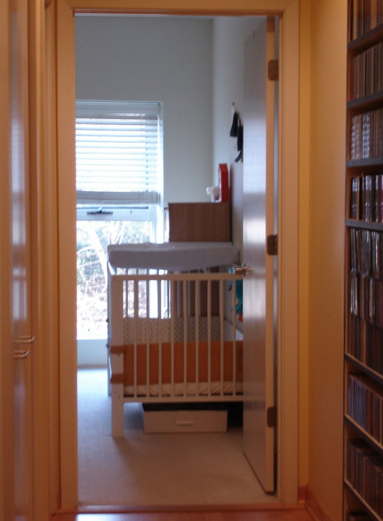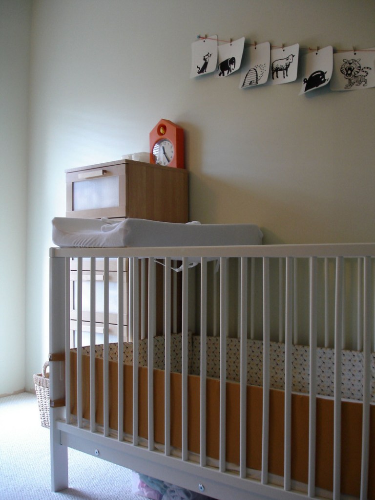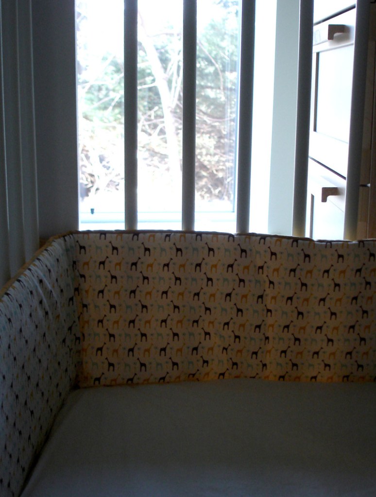 – Here are some photos of our little nursery. It’s only a small portion of the small room that is also our office. There’s not much to the little nursery area. Dad is making a wooden tray that will sit on the top of the crib to hold the diaper changing station. I made the crib bumper with little giraffes on the fabric. And we bought a little dresser with 5 drawers – I hope it will hold most of her clothes and diapers. I don’t think baby will mind sharing her space with our computers. I look forward to decorating a toddler room someday when we move.