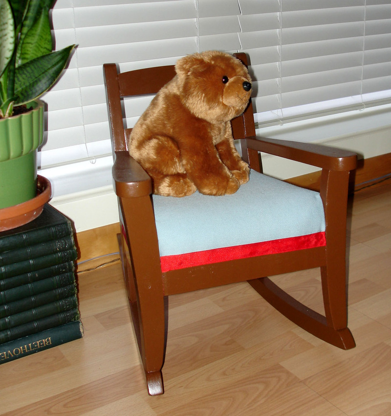 – One more photo – this is a little chair that was Dad’s – I painted it and put new fabric on the seat. The bear is from Grandma J. I can’t wait to see baby sitting in her seat.