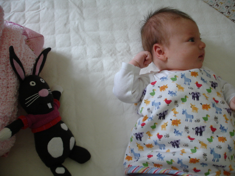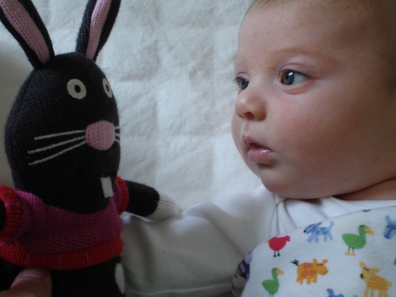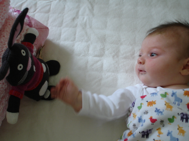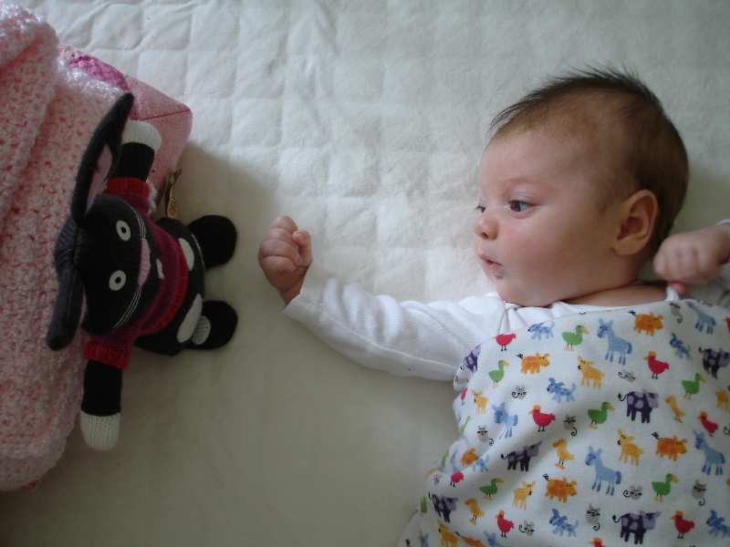 The good times are watching Bea smile and start to giggle and develop her motor skills. She likes to look at Bucky the Bunny and talk to him. Then she’ll reach out to him and try to grab him but so far she can only bat him around. Then she starts to get mad – you can hear her voice turn into kind of a frustrated little yell. Pretty soon she is just furious with Bucky and she might turn her head away or I’ll take Bucky out of the crib so she’ll calm down. I could stand there at her crib and watch her funny little expressions forever.