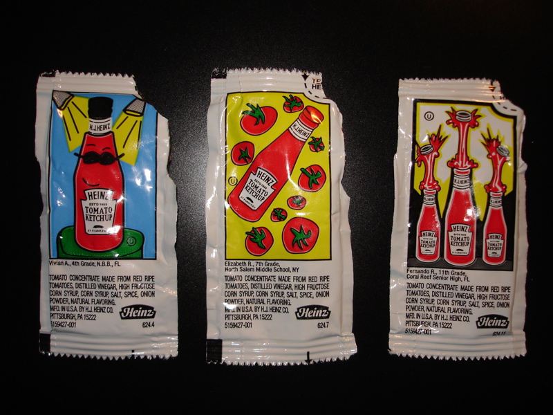 Cool ketchup packets with artwork by kids.