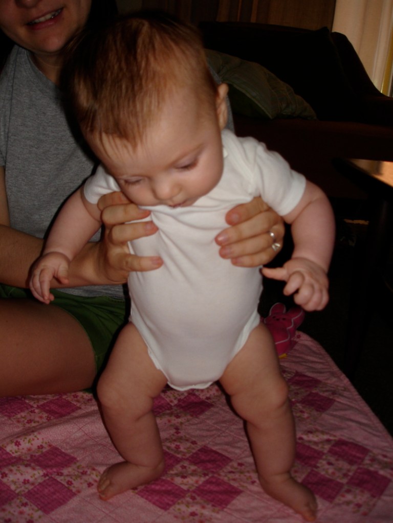 What have we been up to? Well Bea’s latest developments are her love of standing and the drool factory that has developed in her mouth. Here she is using her strong little legs. Our friend, Annie sad her legs are like lotus roots – soft on the outside and strong on the inside.