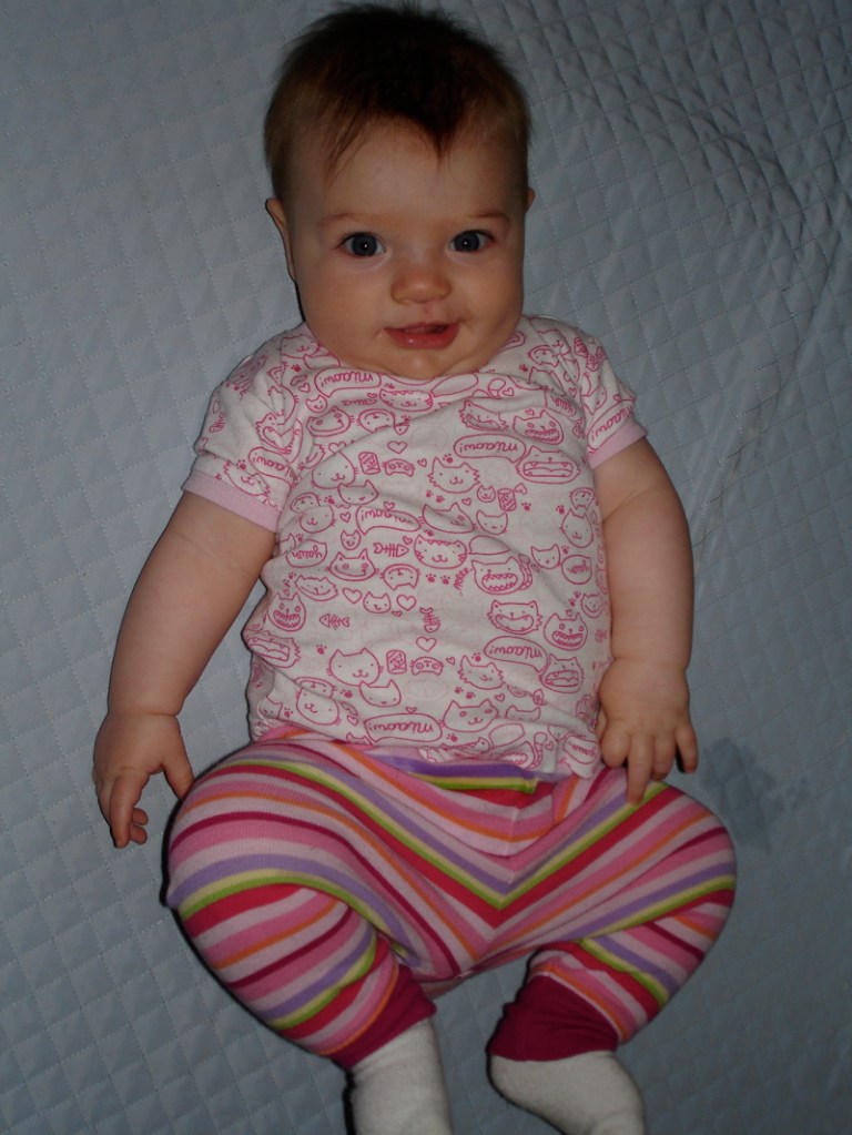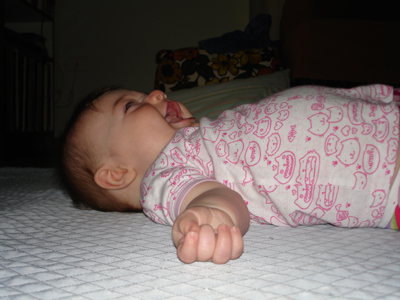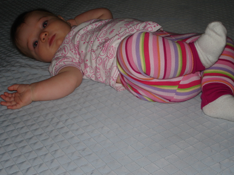 Bea has finally learned to roll over from her belly to her back. Before last week she could only go from her back to her belly and then she would grunt and whine until I came to turn her over. There’s still one more milestone for her – she needs to learn to roll both ways. So far she can only roll to her right. I’ve spent the past few days watching her roll across the floor until she gets to a chair or a wall or a pillow barricade and then she starts struggling and getting mad. So I turn her 180 degrees and she continues on her merry way rolling accross the room.
