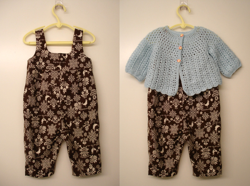 Simplicity Overalls Pattern 4054, darling fabric from Superbuzzy and although I wish I could say I made it, the little cardigan is from a used clothing store.