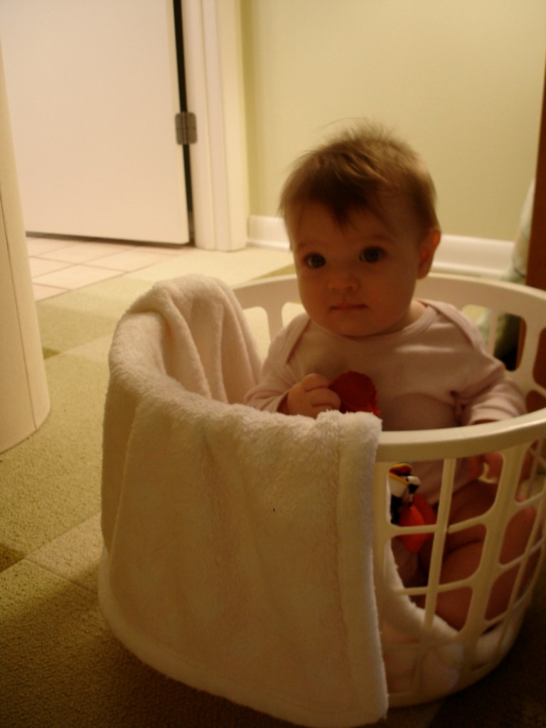 Lately she will sit in a laundry basket and play by herself while I do things around the house. I don’t think this will last too long but I’ve been taking advantage of it while I can and she is so cute in the baskets.