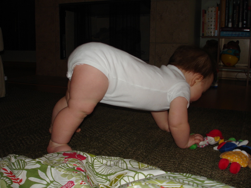 Bea has been getting around and exploring her surroundings more and more everyday. She likes to pull all her toys and books off the shelves. The other day when she was playing in our bedroom she discovered that the bathroom was nearby and when she saw the tub (where she gets her baths) she got really excited. She doesn’t seem very interested in truly crawling. Her little routine is to go a couple steps and then sit up and then do that over and over again. She likes to get up on her hands and feet with her butt in the air like this: