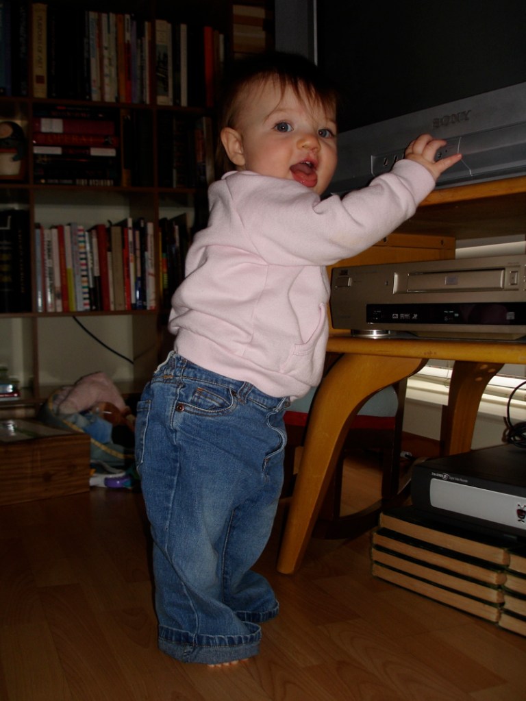 And she is just starting to pull herself up to a standing position. She gets a big proud smile on her face when she stands up. Here she is pushing all the buttons on the TV: