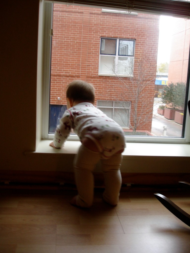 Here she is looking out the window and saying hi to all our neighbors: