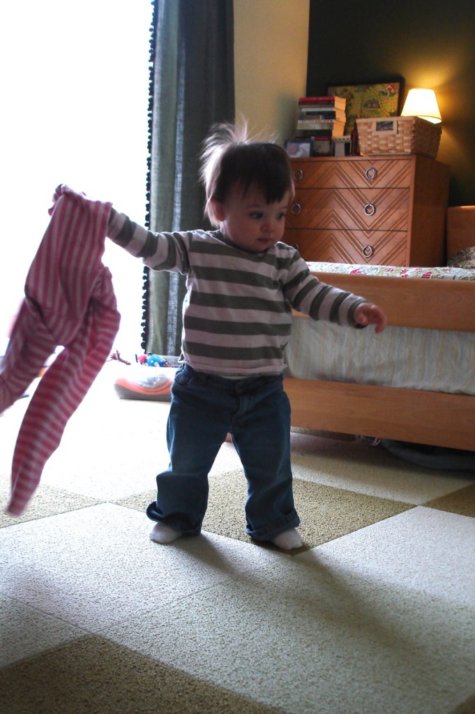 Yesterday my baby left me and in her place… a toddler. Yes, she walks. So far she hasn’t taken too many steps and she hasn’t realized the possibilities that come along with walking. She’s still in tune to crawling and being close to the ground. And yet she gets this huge smile on her face when she realizes that she’s standing there without hanging onto anything. I tried all day to get a video of her walking but I didn’t have any success. Here are some silly little videos anyway. In the second one she is feeling a little angry and I can’t help but laugh at her.