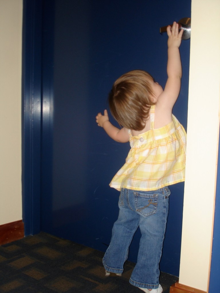 Learning how those door handles work. Doesn’t she look grown up?