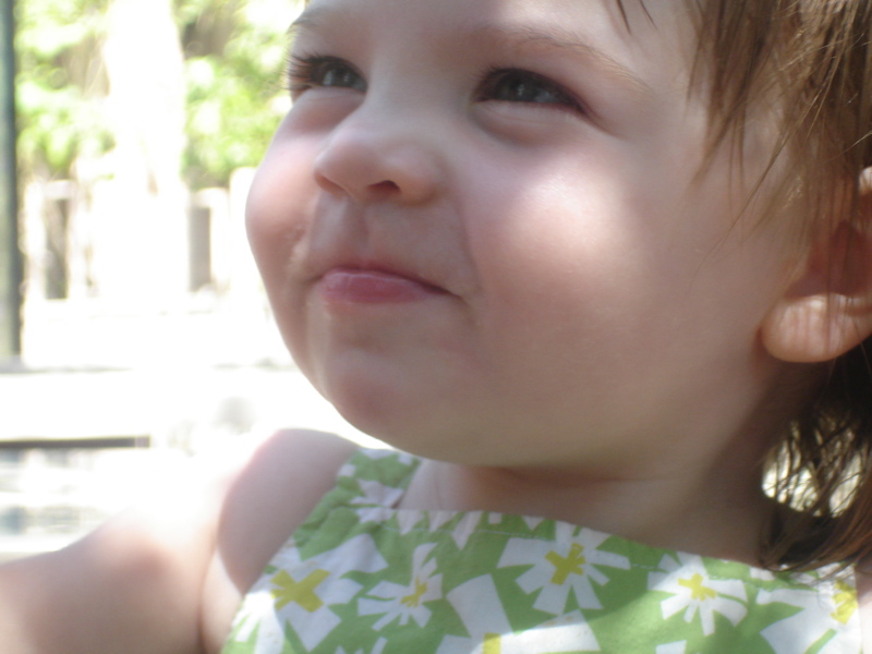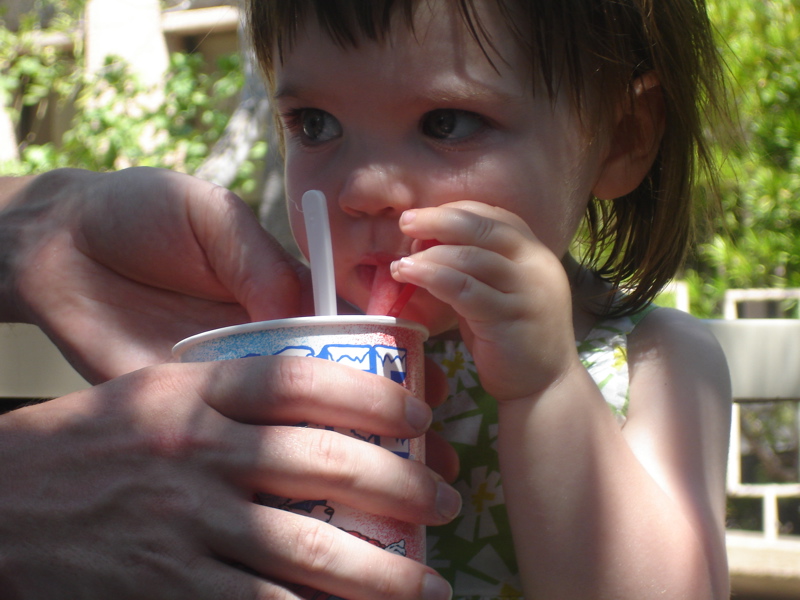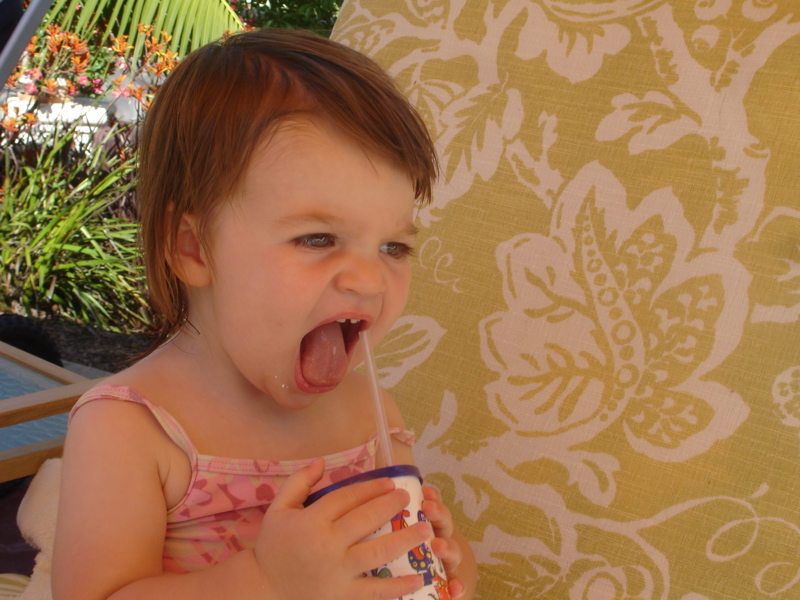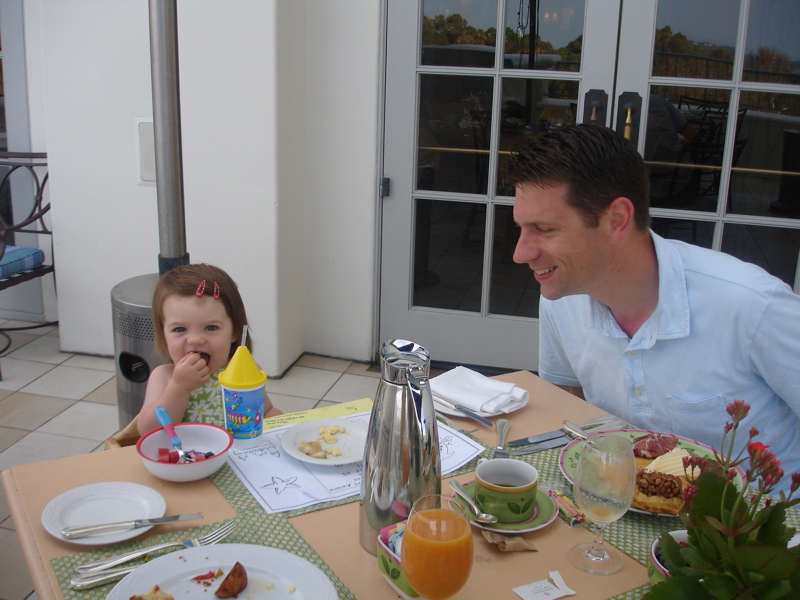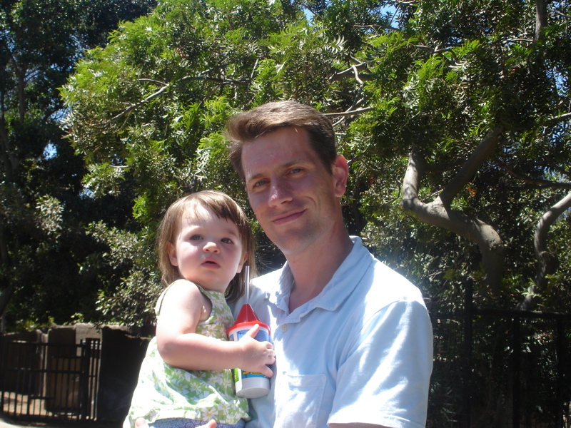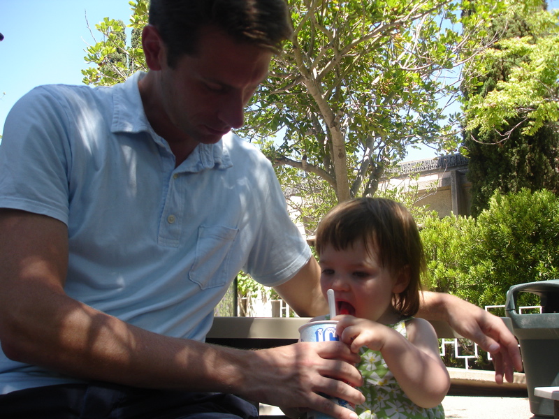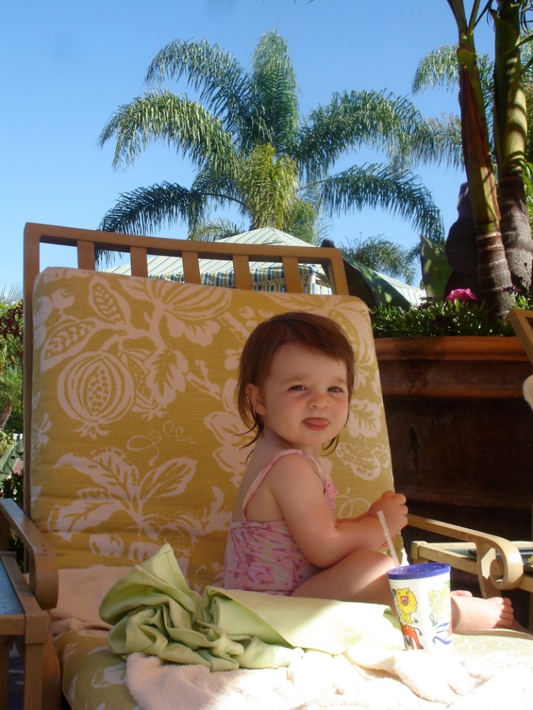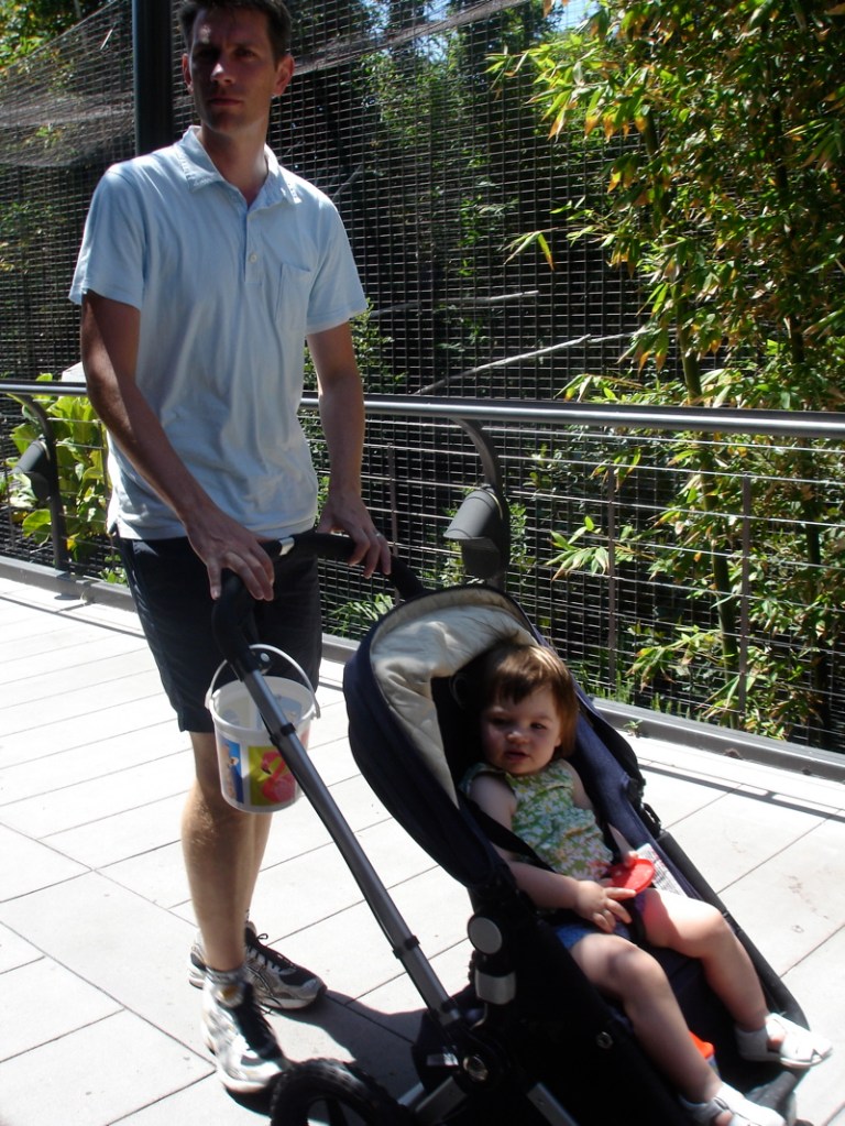 We got back from our San Diego trip last night. We had a great time – it just went too fast. We were there to celebrate the 25th anniversary of the company that Brian works for. It felt like a very luxurious few days, or as Brian put it “the founders dropped a lot of money”. We stayed at a really nice hotel where it seemed like there were twelve employees per guest. The type of service that is so attentive it makes me a little uncomfortable. The hotel was chosen partly because of it’s kid friendly features. All the principles and managers were invited to bring their families and wow the number of five and under kids was impressive. The company is really being productive – in and out of the office. The hotel had a buffet table for kids that was a foot and a half off the ground. They had a special kiddie pool and a snack area at the pool with mini tables and umbrellas. They had a plate of cookies and milk waiting when we arrived – the plate had Bea’s name written in chocolate. They must have had about 100 high chairs available at all the group meals. And at the restaurants they had special kid’s silverware and dishes with characters on them. I could go on…. There were also a bunch of fun activities like an Amazing Race style scavenger hunt in the Gaslight District of San Diego. And we took a trip to the zoo. The food was really good – not scary buffets but interesting, fresh and beautiful. I never did get to take advantage of the spa but I had a great time. I got to meet a bunch of Brian’s co-workers from all over the world. And I suppose I could get used to that kind of luxury (ha ha).