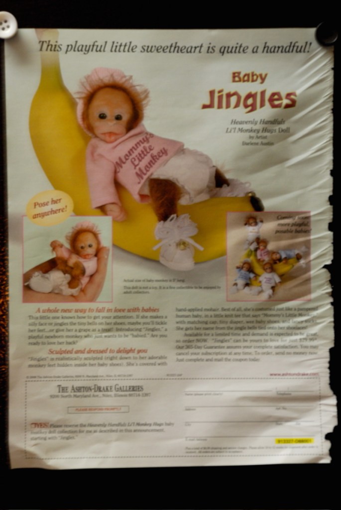 “Jingles” is realistically sculpted (right down to her adorable monkey feet hidden inside her baby shoes.) She’s covered with hand-applied mohair. Best of all, she’s constumed just like a pampered human baby, in a little knit tee that says “Mommy’s Little Monkey,” with matching cap, tiny diaper, wee baby shoes, and fancy socks. She gets her name from the jingle bells on her shoelaces!