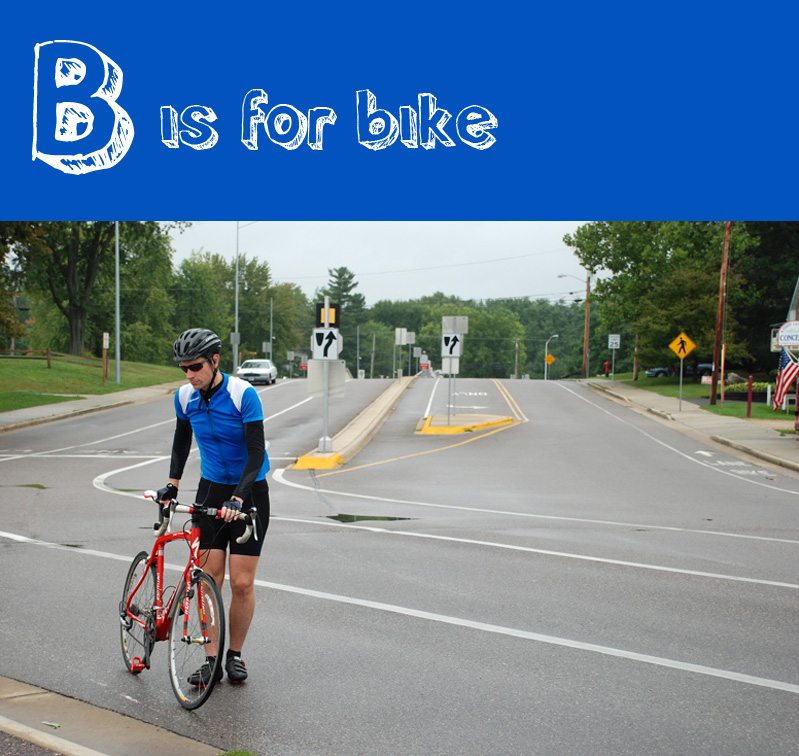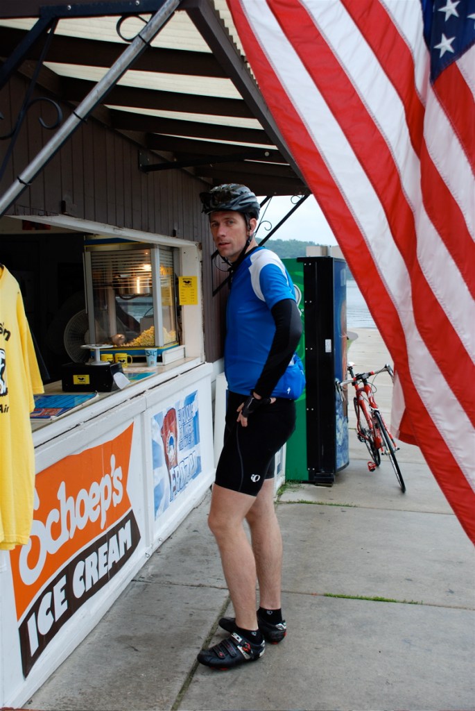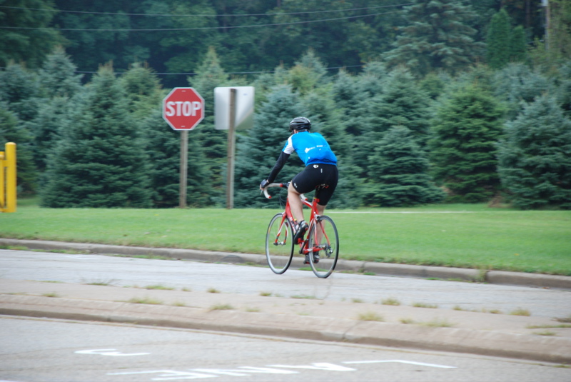 Off he goes into the hills of Wisconsin. Doesn’t he look just like a professional biker? And he’s very encouraging and patient while his pokey wife huffs and puffs up those hills.