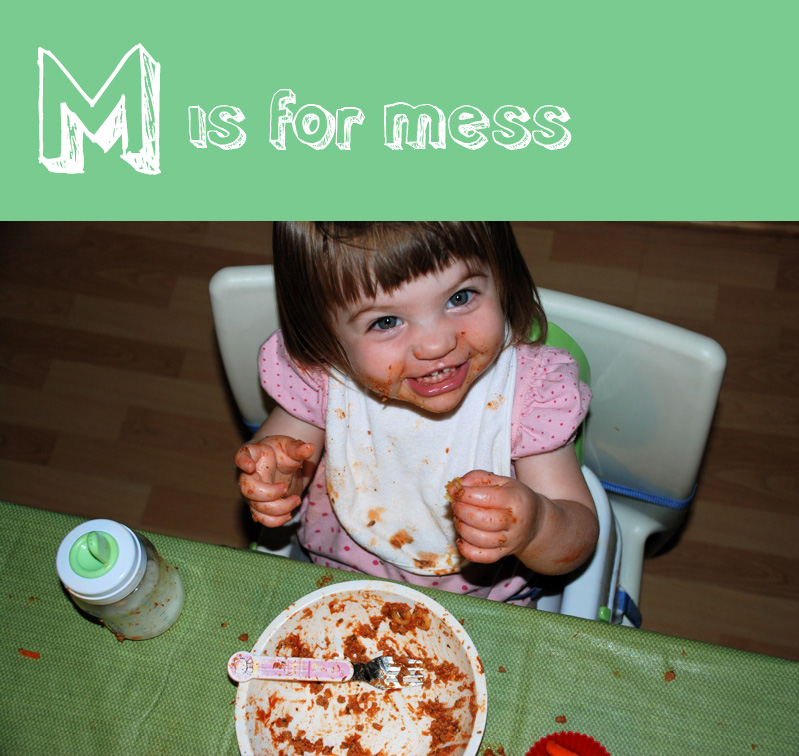 Will someone please tell me that this is the messiest stage she’ll go through. She’s at a point where she’s learning to use her fork and spoon – and I want to encourage that, but good gracious, I don’t think I can handle much more yucky like this. It takes me forever to wipe her down after meals, trying to keep her clothes stain-free is futile, and no matter what I do little bits of gross remain and end up slowly dingy-fying the couch and anything else she comes in contact with. Occasionally if she gets her hands really dirty outside I’ll fill the sink with soapy water and let her wash her own hands. It gets the dirt out from under her nails, but I’m just left with another kind of mess.