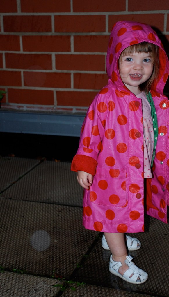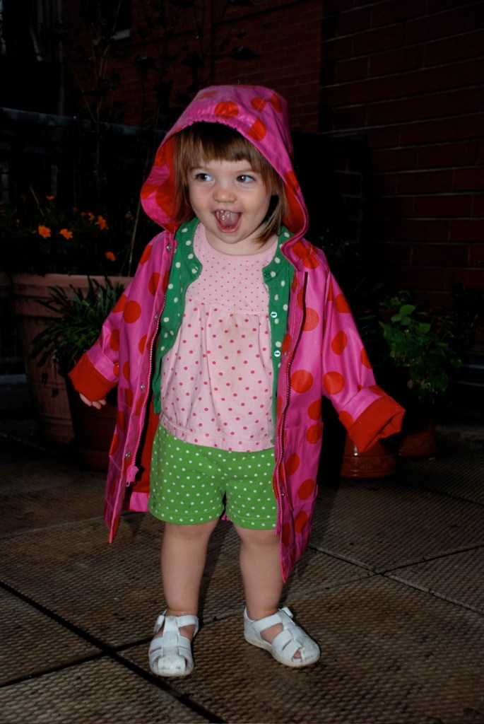What else do you do on a dark and rainy day but get out all the polka-dot clothes and splash in the puddles.