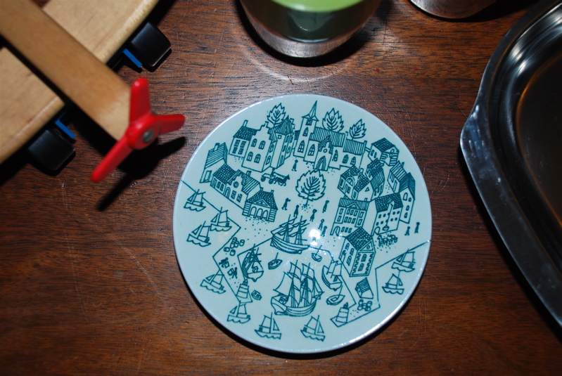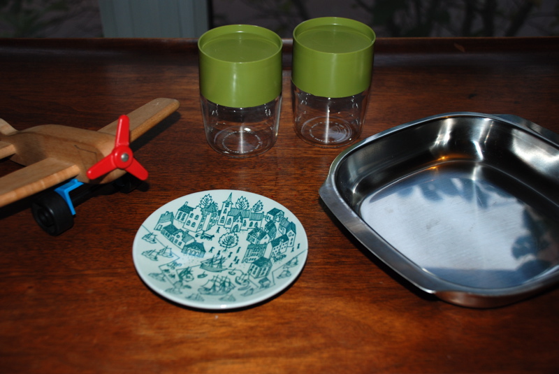 Saturday morning I went to a rummage sale at a big church near our house. Look at all the loot I got for four dollars. An airtane (that’s airplane to you), some little Pyrex storage jars, a metal serving dish and a cool little Danish dish. Even if I hadn’t found anything it was very entertaining to walk around the rabbit warren of basement rooms in the church and see the over-eager people rummaging. Plus, it’s always thrilling when I get to go out and do some shopping all by myself.