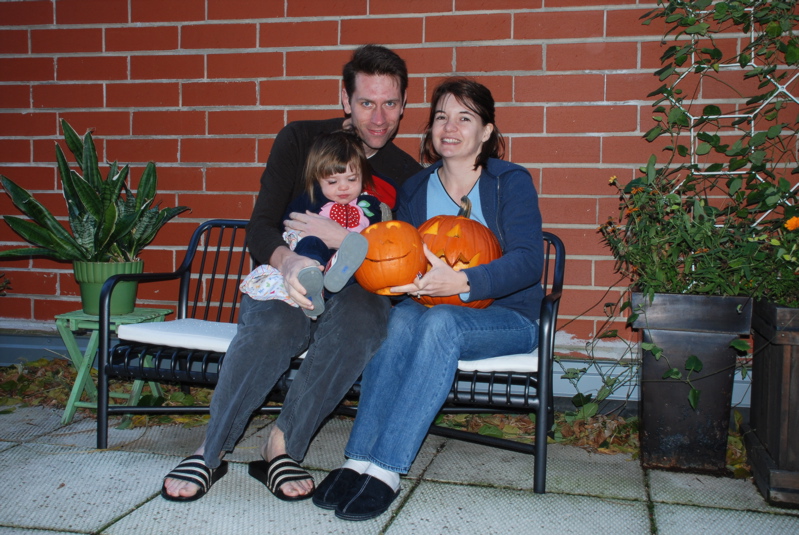 Sunday, I was sick in the morning but my super-hero husband took such good care of me that it was almost a thrill to stay in bed… almost. I was feeling better by the evening and so it was time to carve pumpkins. Bea started crying in horror when I cut open the first pumpkin and she glimpsed her first pumpkin guts.