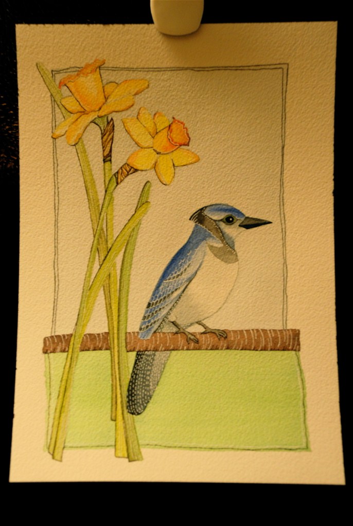 Here’s my little bird with some daffodils. I like Geninne’s technique of using white ink to add linear details. My painting has nowhere near the charm that Geninne’s do, but I found it really relaxing and fun to make!