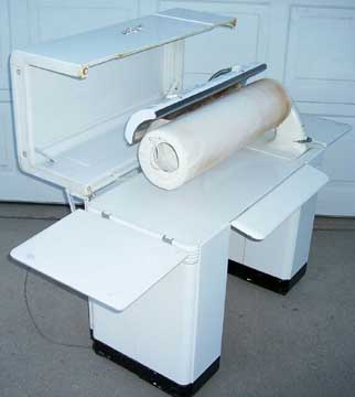I learned that the chair is called the Ironrite Health Chair. It was made in Detroit around 1938 and it was made to go with an ironing machine. The kind with a big roller. Like this: