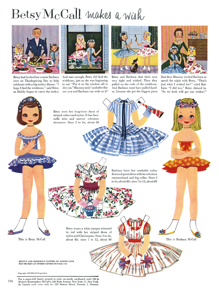 Have you heard of Betsy McCall? She’s a paper doll from McCall’s Magazine. She was introduced in 1951 and was created by different illustrators all the way through to 1961. I think Bea is a little young for this, but in the future I am so excited to print out a bunch of these so we can play with them. To learn more about Betsy McCall or print her, along with her fabulous outfits, go here. This makes me so appreciative of classic toys. And it also makes me excited for the new season of Mad Men.