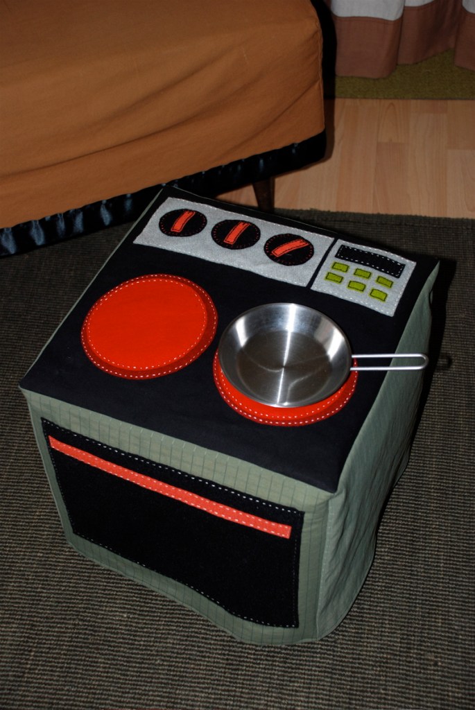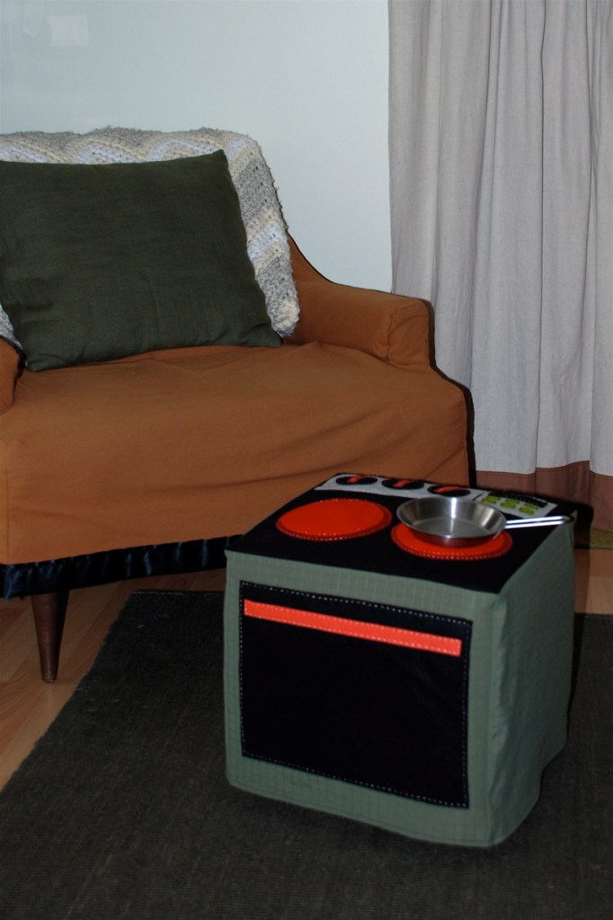 This is what you get when you really want a play kitchen but you don’t have room for one more thing in your house. I made a new slipcover for our footstool. Here’s my before and after.