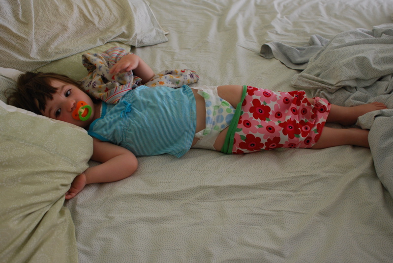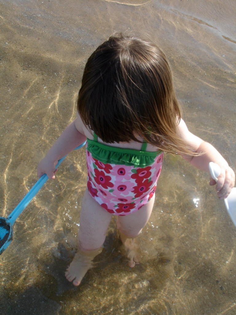 – We’ve been going to the beach – often. Bea is in love with her swimsuit. The other day I peeked at her while she was napping in my bed. She had managed to put her swimsuit half on before she passed out. The other benefit of the beach – good long naps. She slept a long time with her swimsuit up around her legs and hips.