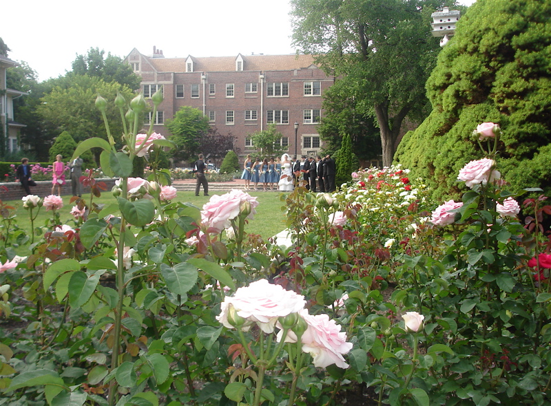 – We take nice long slow walks – often. This day there were people getting married in the rose garden near our house.