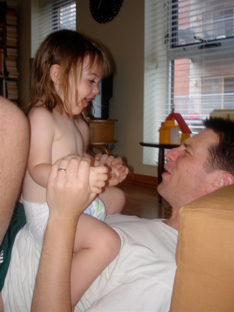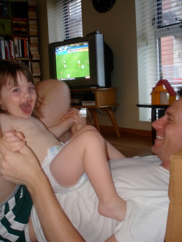 – Bea’s been hopping on her pop. Whenever Brian gets down on the floor and especially if he’s lying on his back she thinks it is so funny to bounce up and down on his belly. Here they are – Brian was just trying to catch up on a soccer game.