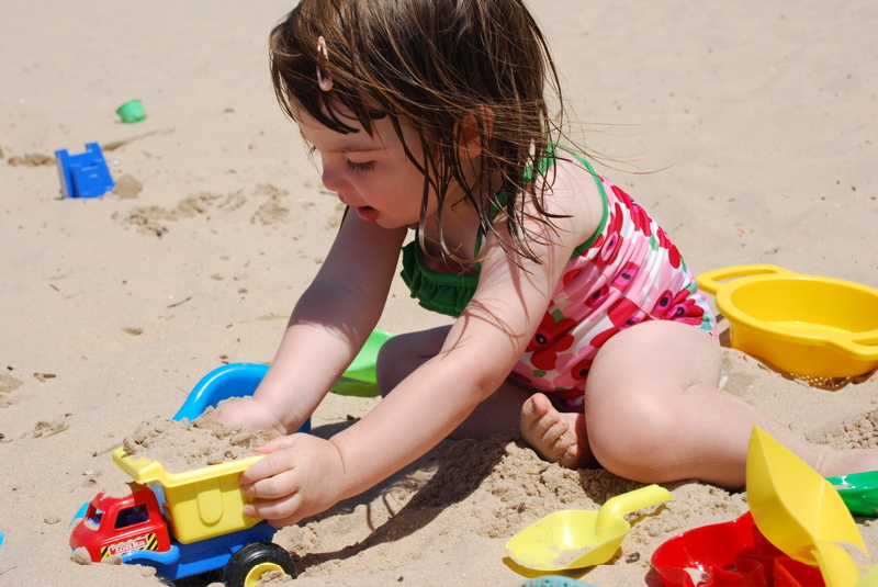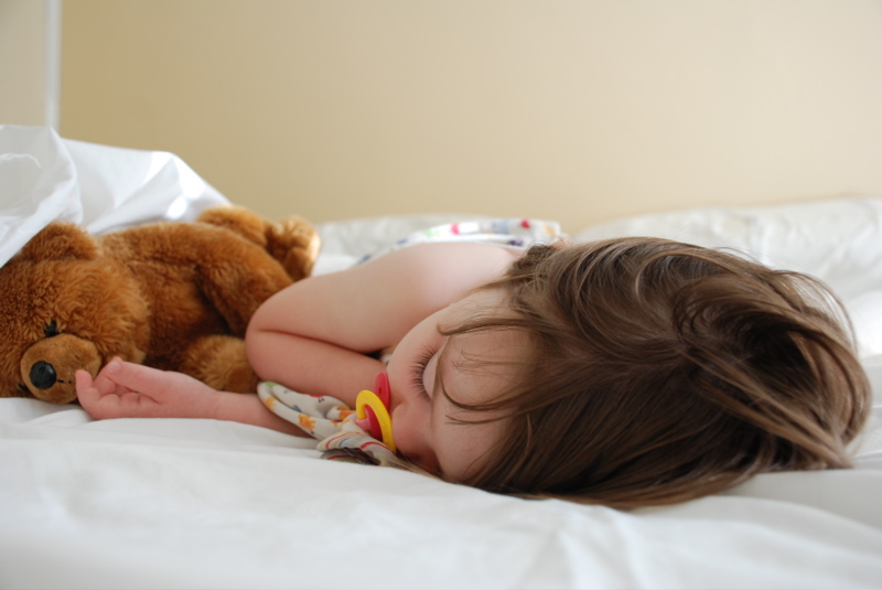 A very tired girl napped on sandy sheets in a bright sunny room.