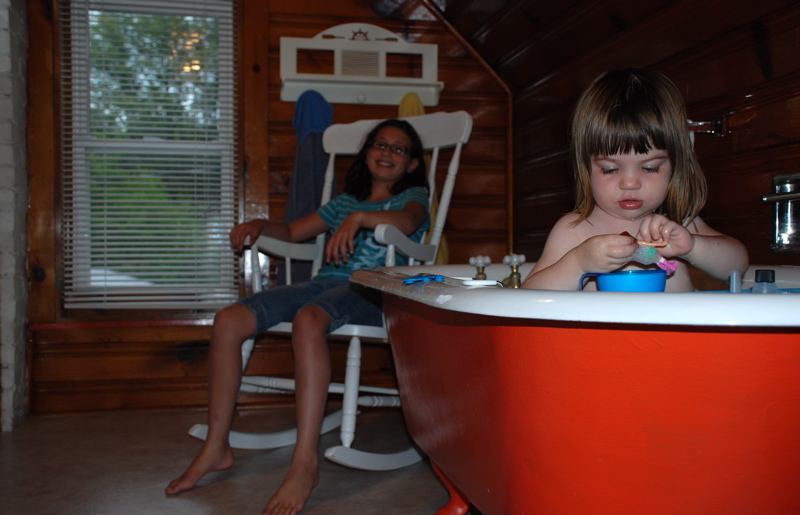 A claw foot tub and a rocking chair in the upstairs bathroom were well used.