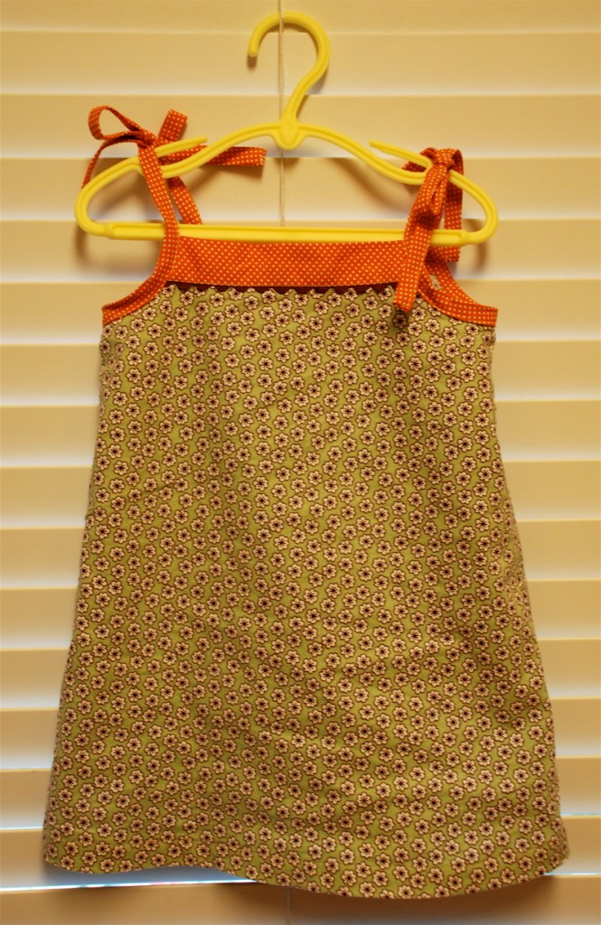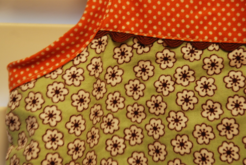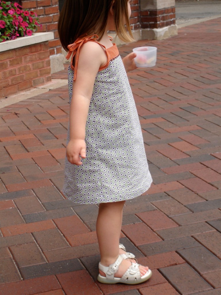 The only good thing about Brian being out of town for days in a row is that I can let the house get messy and make stuff. I made this simple little sundress last night. It was really quick and easy to put together. It was offered in the British magazine called Sew Hip and by the pattern company Oliver + S. I have been drooling over Oliver + S patterns for a long time. I get so very inspired when I look at the examples in their Flickr group. And everything I read says they are really great quality patterns. If anyone would like to get a birthday gift for me – uh – here’s your hint.