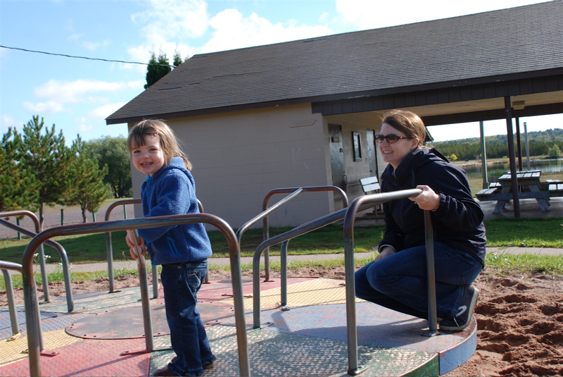 We stopped at a playground while driving up the Keweenaw. You can take your kid to all sorts of new places and have brand-new experiences but sometimes they just need a playground. This one had a merry-go-round. You never see merry-go-rounds. I guess they must have been dangerous. This one was the same model that they had at my elementary school. Good fun.