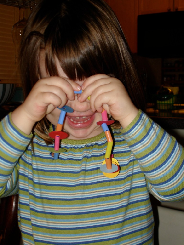 I’ve been a little bit more motivated to do some crafty stuff lately. Here’s one of the necklaces we made the other day out of straws and paper. This is what she did when I said “let me take your picture with your necklace”.