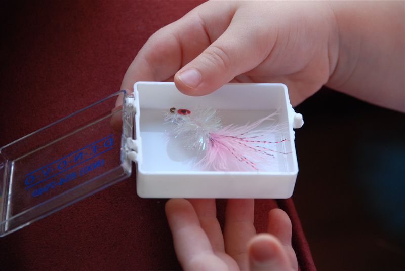 And Bea showed a big interest in Dad’s fly tying supplies. He would get out the various sparkly yarns and she actually waved her arms in the air with excitement. So he made a pink and white Bunny Bugger for her. When we got back home the first thing she asked for the next morning was her Bunny Bugger.