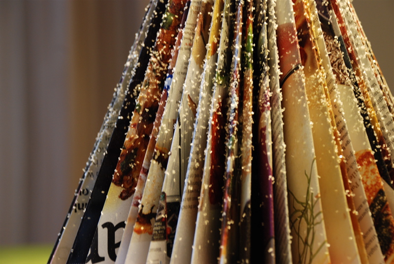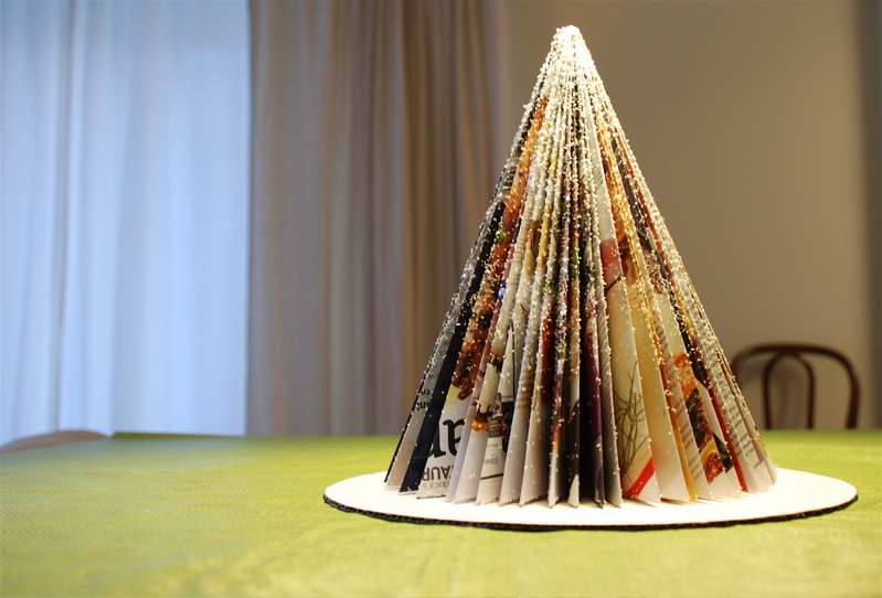 I made this kitschy craft after seeing it on Martha Stewart yesterday. It’s a christmas tree made by folding up an old magazine.