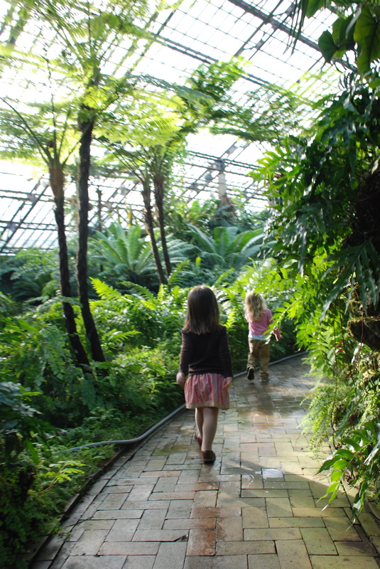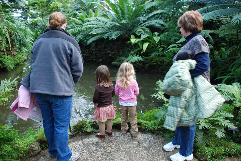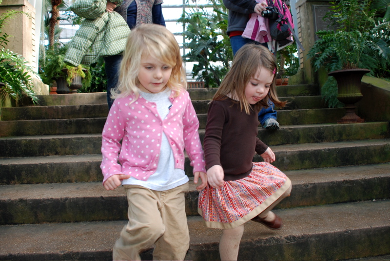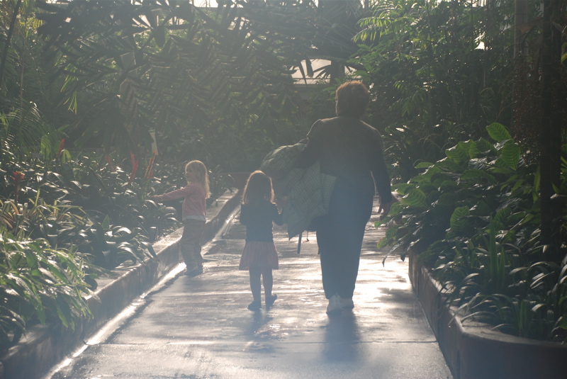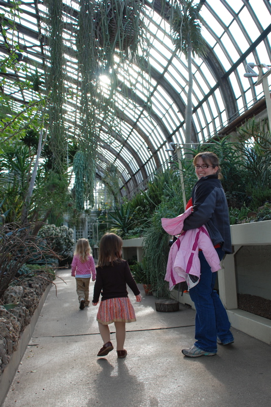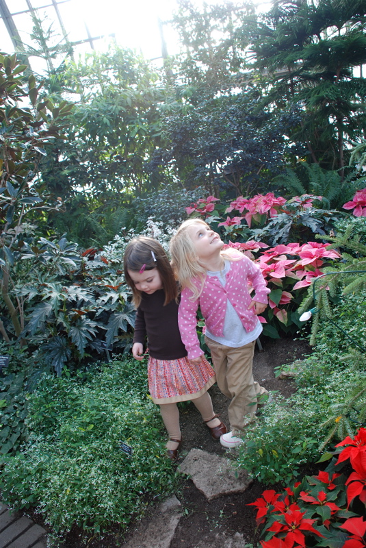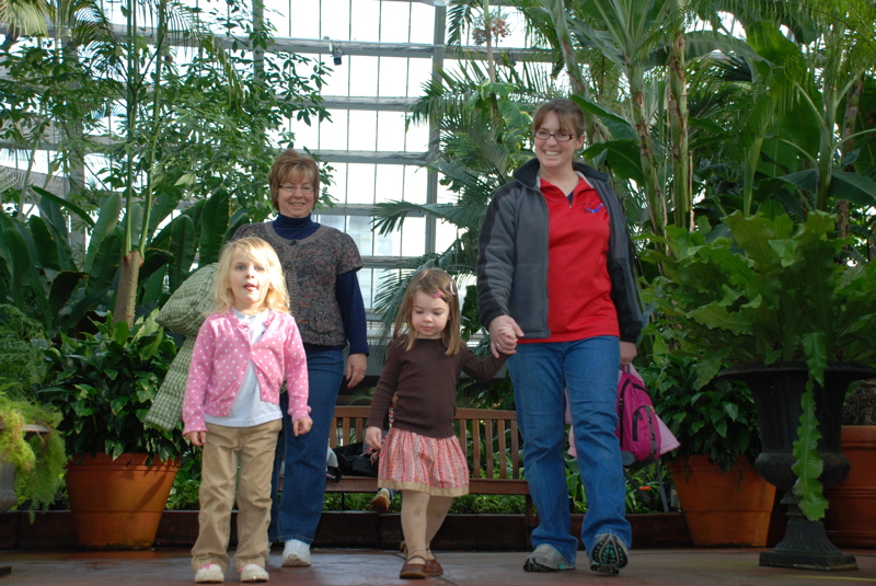 Jennifer, Jenna and Mom visited over the weekend. We had a great time filled with Christmasy stuff like visiting the Wonderland Express display at the Chicago Botanic Garden and spending a whole afternoon decorating cookies. On Saturday we went to the warm and humid Garfield Park Conservatory. The plants looked so good, lots of poinsettias, so colorful, not a leaf out of place. Luckily it wasn’t very busy so the girls had room to run around and explore. Bea followed Jenna all around. Lots of fun!