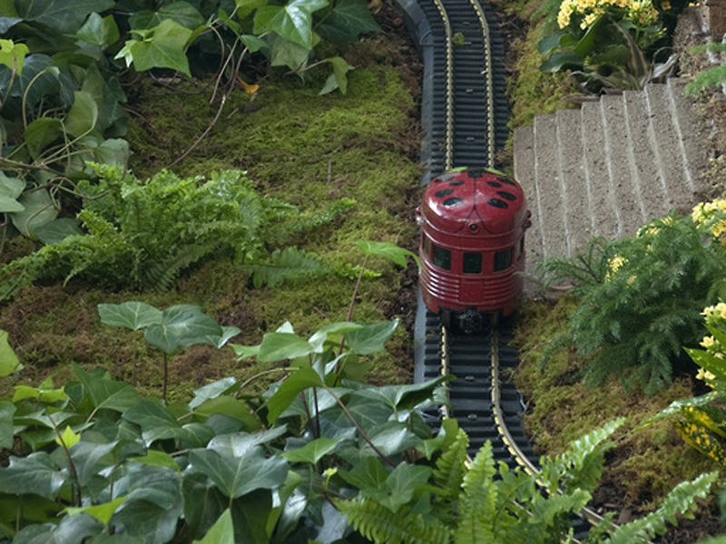 – Bea and I went over to the Wonderland Express at The Chicago Botanic Garden again yesterday. There are a bunch of model trains in a wintery mini landscape with mini Chicago landmarks. There is one little train that looks like a ladybug and they have it set up so it pops out of a tunnel at regular intervals. They have the same ladybug train outside in the summer and Bea gets very excited about it. Well yesterday as we came around to the area with the ladybug train I was telling Bea to start looking for it and I noticed some of the “engineers” down on their knees peering into the tunnel with a flashlight. Apparently the ladybug got stuck somehow in the tunnel. Bea was so engrossed – she wouldn’t move from that spot and she asked over and over “what happened to the ladybug train?” We never did get to see it, we just talked about it all the way home. She’s still bringing it up at random times today and I don’t expect it to stop any time soon. Here’s what the train looks like: