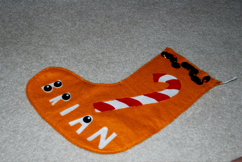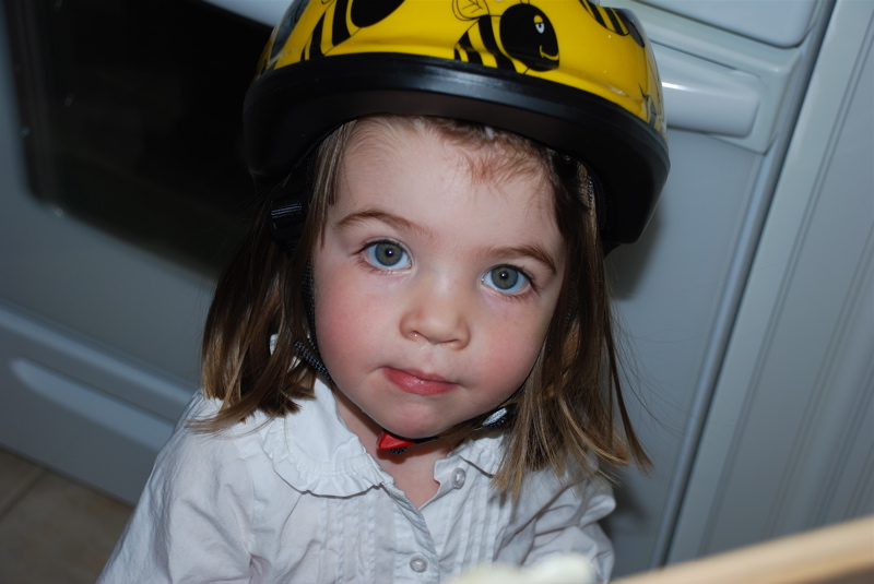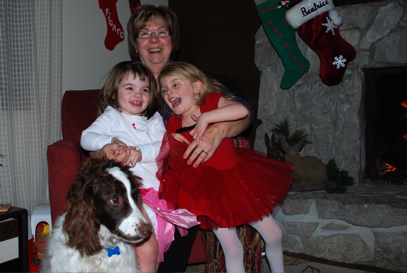 Christmas morning at Grandma and Grandpa C.’s. I love how Brian’s Mom made the letters on his stocking. See how the sequins form the inside parts of the B, R and the A. Love it. A photo of opening presents and Bea wearing her new bee bike helmet.