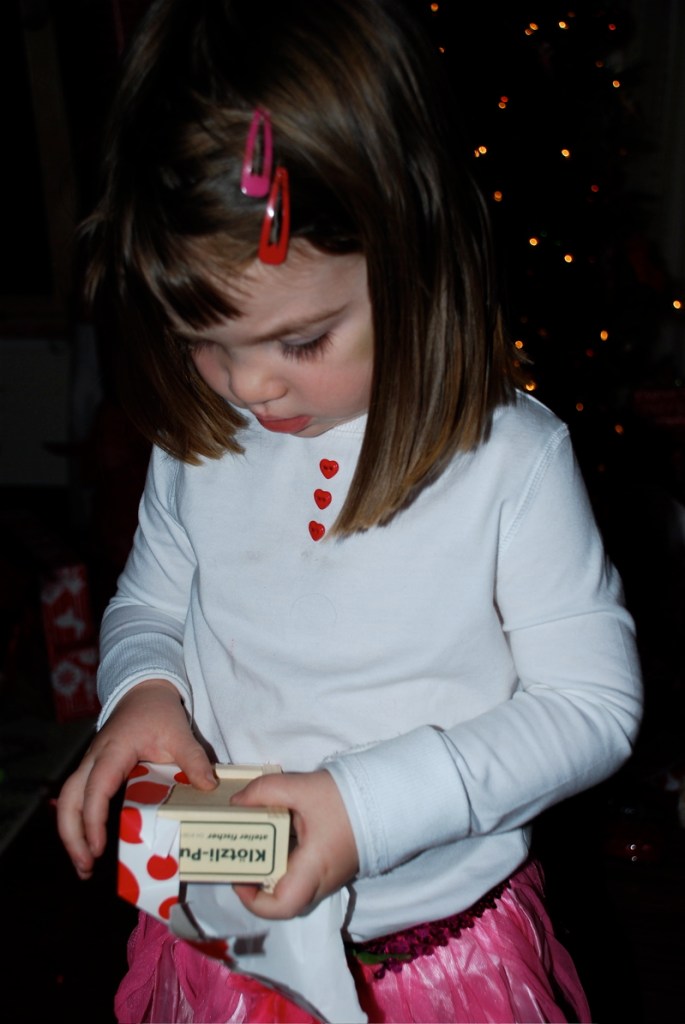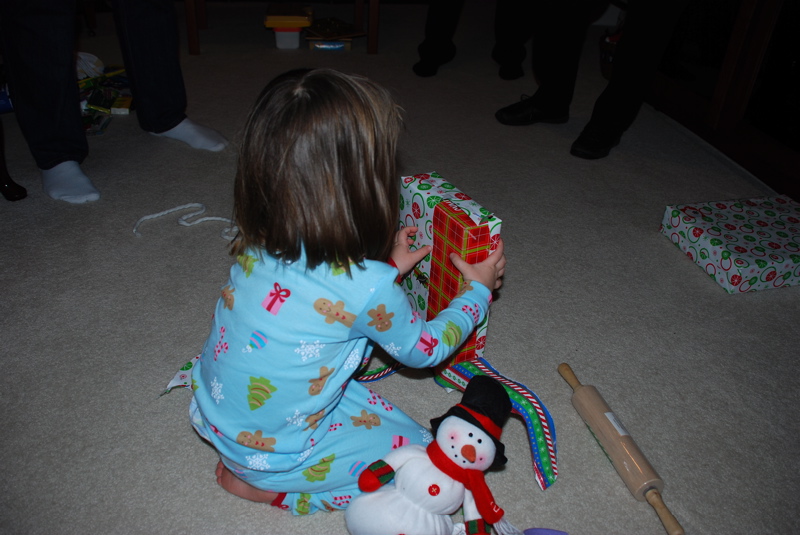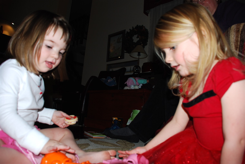 Some shots from Christmas Eve at Grandma and Grandpa J.’s house. Jenna in her adorable Christmas dress that Jennifer made. Bea not in her Christmas skirt because she found Mom’s stash of dress up clothes and opted for a pink fairy skirt instead. Grrrr. Also Bea and Jenna playing Hungry Hungry Hippo.